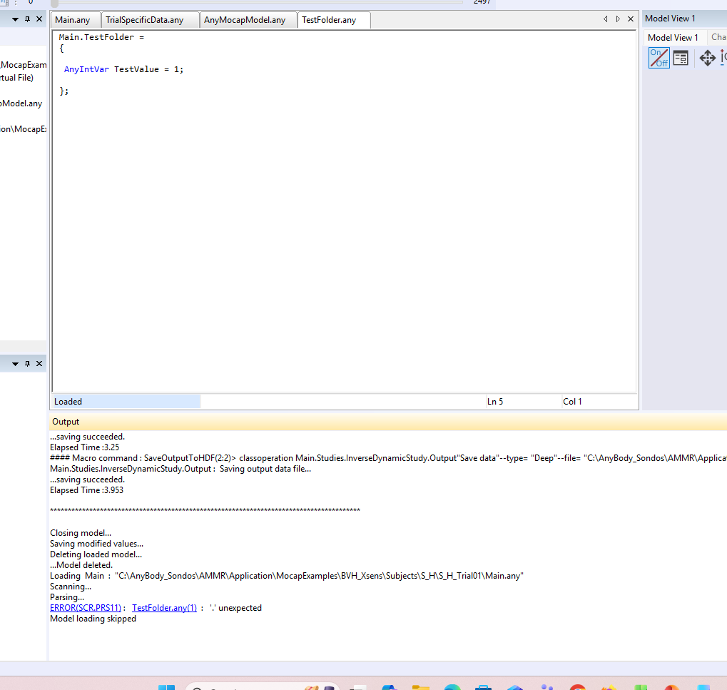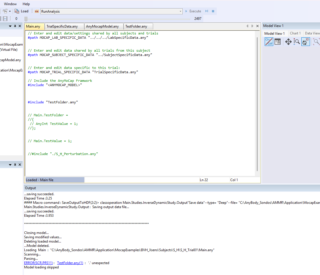 I imported my own Xsens BVH file and can successfully run the full example pipeline (MarkerTracking and InverseDynamicStudy). However, I cannot add any additional AnyScript code via a new .any file, even a very simple test, without getting syntax/parser errors.