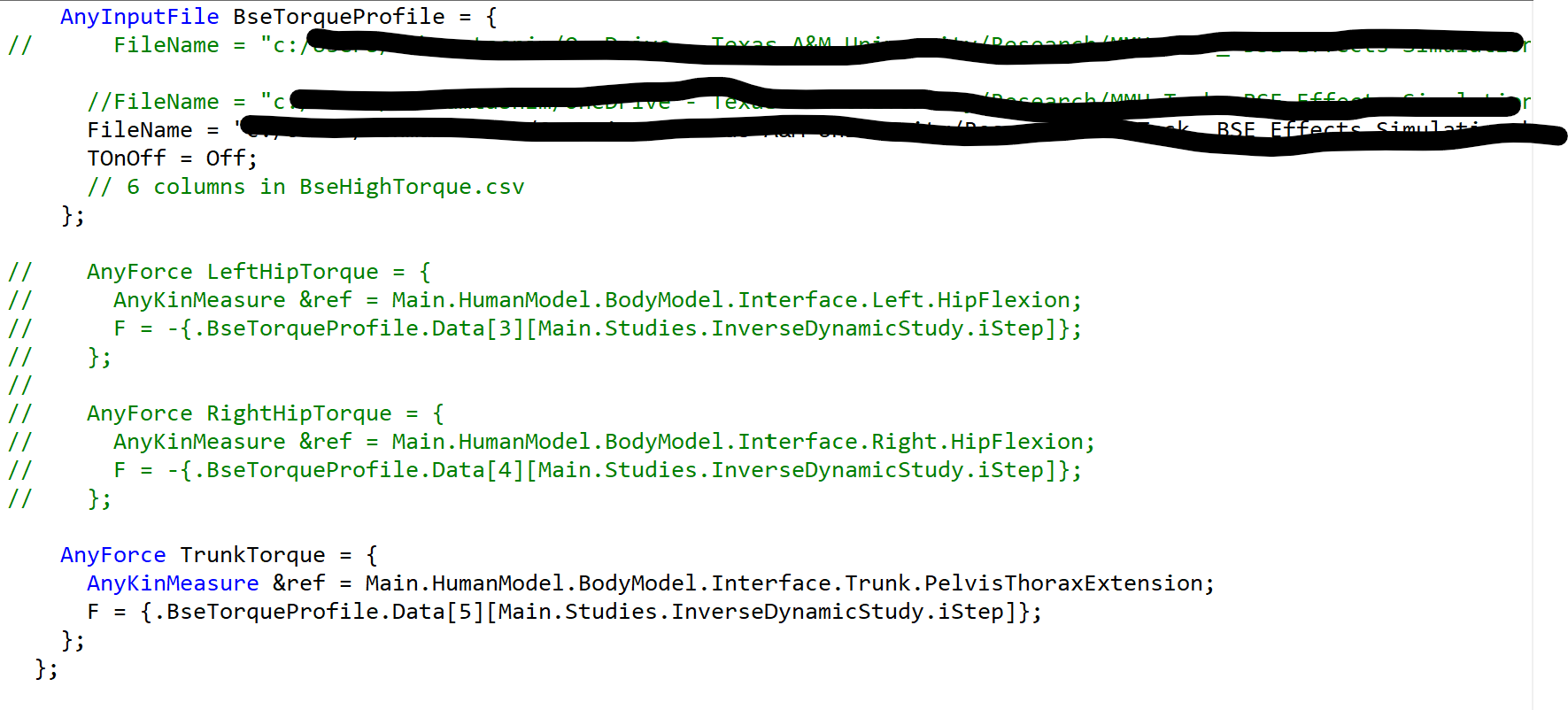 I am using AnyBody v8.1 for an inverse dynamics study on back exoskeletons. I am running a counterfactual simulation using MoCap data recorded while the subject was wearing the exoskeleton. I am comparing two conditions on the exact same motion kinematics: